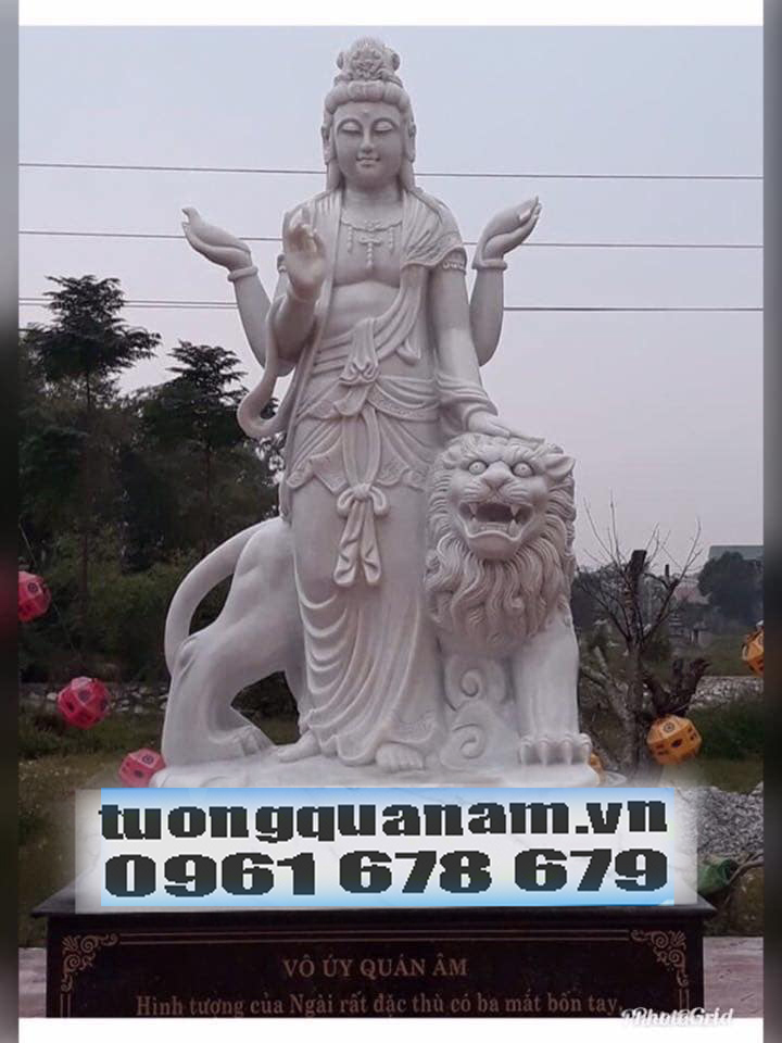 Vô Úy Quán Âm: Hình tượng của Ngài rất đặc thù có ba mắt bốn tay, ngồi trên lưng sư tử trắng, đội bảo quan, hai tay bên phải, một tay cầm hoa sen trắng, một tay cầm con chim cát tường trắng; hai tay bên trái, một tay cầm pháp khí hình con phượng 3 đầu, một tay cầm con cá. Khắp thân có ánh sáng, mặc thiên y đeo anh lạc, diên mạo rất đoan nghiêm.